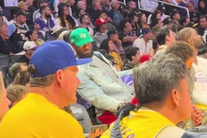 詹姆斯场下偷看二儿子比赛,突然意识到湖人比赛还在打呢