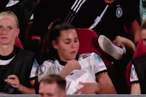 转头迎惊喜!德国女足球员放松腿部,结果把脚放到了队友旁边!
