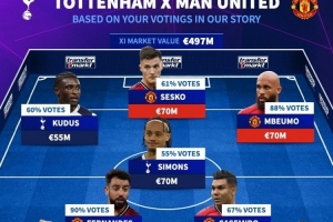 德转票选热刺+曼联阵容:B费、舍什科、西蒙斯在列,主帅阿莫林