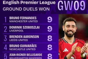 拼了!英超第9轮地面对抗成功榜:B费和索博斯洛伊9次并列居首
