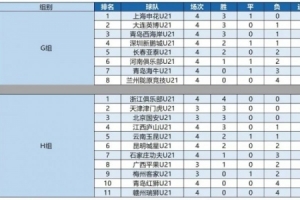 U21联赛积分榜:西海岸津门虎分居小组首位 庞开元7球领跑射手榜