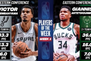 文班场均33+13+6!字母哥场均36+16+7!两人当选首周东西部周最佳