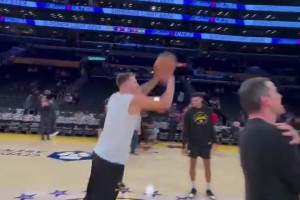 哪有军训教官的东契奇赛前飙中圈三分,助教们俯卧撑愿赌服输