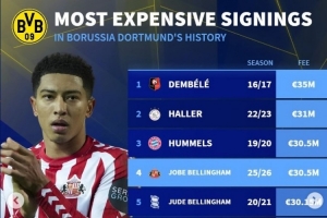 体育资讯6月11日讯 多特已经官方宣布签下小贝林厄姆,据悉基础转会费3050万欧元,《转会市场》也统计了多特队史的引援榜单。