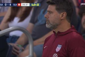 上半场第36分钟,瑞士队已经取得了4-0领先,打崩了美国。场边美国主帅波切蒂诺风中凌乱不知所措。