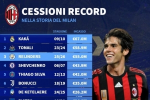 体育资讯6月11日讯 德国转会市场统计了米兰出售球员的转会费,并列出榜单,卡卡6700万欧居首,赖因德斯5500万欧第三。