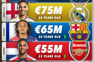 体育资讯6月13日讯2024-25赛季结束,Score 90更新了右后卫身价排行,巴黎圣日耳曼后卫阿什拉夫8000万欧元第一,皇马新援阿诺德7500万欧元第二。