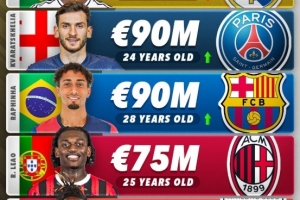 克瓦拉茨赫利亚(巴黎圣日耳曼):9000万欧元