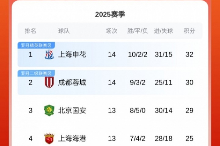 排名第三的国安2-1小胜亚泰,在少赛一场的情况下只落后申花3分。