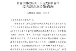 根据省政府《研究促进体育事业发展专题会议备忘录》关于“对中超俱乐部加大政策资金支持”有关要求和吉林省财政厅《关于下达支持长春市足球建设发展经费的通知》(吉财教指〔2025〕263 号)精神,现一次性下达支持长春市足球建设发展经费 2000 万元,用于支持长春市落实专题会议精神,支持中超俱乐部建设发展。执行中收入科目列“1100307 文化旅游体育与传媒”,支出功能分类科目列“2070399 其他体育支出”,政府预算支出经济分类科目列“50502 商品和服务支出”,部门预算支出经济分类科目列“3029901 其他商品和服务支出”。请确保专款专用,不得截留或挪作他用。形成绩效目标后,报我局备案。