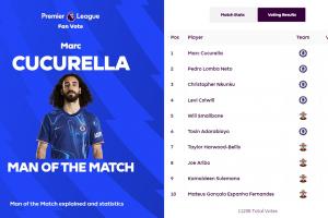 体育资讯2月26日讯 本轮英超,切尔西主场4-0战胜南安普顿。此役库库雷利亚发挥出色,以42.7%的得票率当选全场最佳球员。