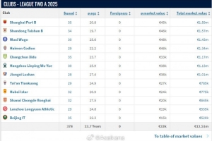 俱乐部总身价方面,上海海港B队以159万欧元排名第一,山东泰山B队以157万欧元排名第二,广西恒宸以146万欧元排名第三,无锡吴钩以143万欧元排名第四。