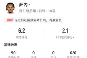 萨内本场比赛首发打满全场,两次获得单刀机会,却两次都被本菲卡门将扑出,另外有两脚射门放了高射炮,7次尝试过人仅有1次成功。