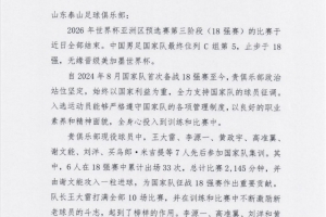 新黄河报道称,6月20日,中国足球协会向山东泰山足球俱乐部致感谢函,对山东泰山足球俱乐部全力支持国家队球员征调,备战2026年世界杯亚洲区预选赛第三阶段(18强赛)的比赛表示感谢,并对山东泰山队员在国家队集训、比赛期间表现出的拼搏精神和职业态度给予充分肯定。