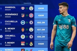 体育资讯6月26日讯 科尔克兹正式转会加盟利物浦,德转也盘点了足坛历史左后卫球员转会费榜单,其中格瓦迪奥尔居首,科尔克兹第7,具体如下: