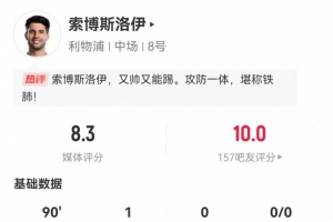 体育资讯2月27日讯 本轮英超,利物浦2-0纽卡斯尔。此役索博斯洛伊首发打满全场发挥出色,球员全场重点数据如下↓