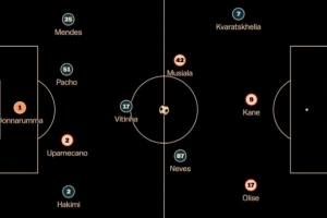 中场:穆西亚拉、维蒂尼亚、若奥-内维斯