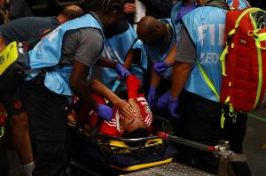 世俱杯1/4决赛,巴黎圣日耳曼vs拜仁慕尼黑,半场结束前,穆西亚拉与多纳鲁马撞在一起,脚踝严重变形,随后被担架抬下场。