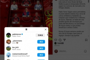 托雷明确表态只愿加盟马略卡,并拒绝了阿贾克斯等欧洲其他俱乐部的邀约。事实上,他在社交媒体上点赞相关动态的举动已引发关注。Instagram账号aficionrcdm发布的马洛卡下赛季潜在首发阵容中,托雷作为前腰与萨姆-科斯塔、塞尔吉-达德尔组成中场三角,而球员本人对该帖的点赞行为进一步点燃了球迷热议。