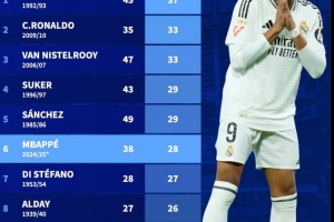 体育资讯2月27日讯 姆巴佩在皇马效力的首个赛季目前各项赛事已经打进28球,距离皇马队史首秀赛季进球数纪录还有9球,以下为具体榜单: