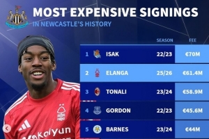 体育资讯7月12日讯 纽卡已经官宣从诺丁汉森林签下伊兰加,《转会市场》统计显示后者也是纽卡队史第二贵引援。