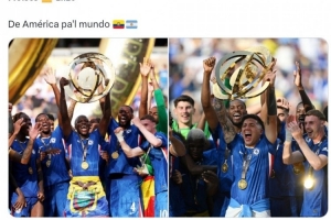 南美足联社媒晒出恩佐、凯塞多举杯的照片,配文:“凯塞多、恩佐,从美洲走向世界。”