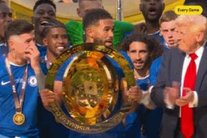 赛后颁奖仪式上,切尔西准备捧杯之际,特朗普一直站在中间。切尔西球员桑切斯对其说了几句话,因凡蒂诺也向其示意。