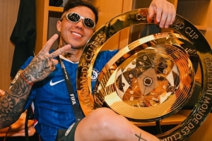 恩佐社媒晒出自己戴着墨镜与世俱杯奖杯的合照,配文:“切尔西!世界冠军🏆🥇💙”
