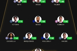 前锋:内托(切尔西,7.63分)、琼-阿里亚斯(弗鲁米嫩塞,7.67分)、帕尔默(切尔西,7.88分)