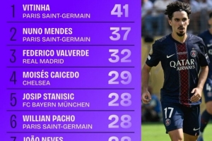 5、斯坦尼西奇(拜仁)、威廉-帕乔(巴黎)、若奥-内维斯(巴黎)——28次