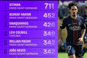 体育资讯7月15日讯 世俱杯传球排名:维蒂尼亚711次断层领先,前十巴黎占7位