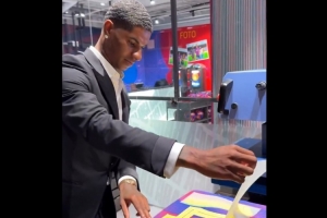 巴萨官推也晒出了拉什福德在亮相仪式上自己动手,为巴萨球衣印上14号的过程。