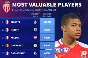 体育资讯2月13日讯 《转会市场》统计了摩纳哥青训出身球员历史身价最贵榜单,姆巴佩无悬念领跑。