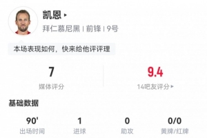 体育资讯2月13日讯 欧冠淘汰赛附加赛首回合,拜仁2-1客胜凯尔特人。此役凯恩首发打满全场,球员全场重点数据如下↓