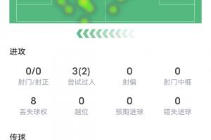 0射门、3次尝试过人、8次丢失球权、传球成功率72.7%