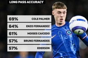 体育资讯3月1日讯 根据OPTA统计,帕尔默是本赛季英超长传成功率最高的球员。