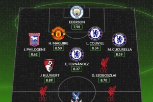 后卫:菲洛金(伊普斯维奇,8.62分)、马奎尔(曼联,8.50分)、科尔维尔(切尔西,8.34分)、库库雷利亚(切尔西,8.59分)