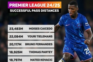 体育资讯3月1日讯 OPTA统计了本赛季英超成功传球距离榜,蓝军后腰凯塞多居首。