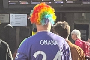 曼联本轮英超不敌布伦特福德,记者Samuel Luckhurst晒出一位球迷身穿奥纳纳球迷的照片,这位球迷还戴了一顶小丑的假发,该记者调侃道:可以肯定的是,这个小伙子不是奥纳纳的最大球迷。