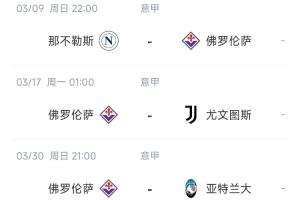 未来3轮佛罗伦萨将连续对阵意甲前4名中的那不勒斯(第2)、尤文图斯(第4)和亚特兰大(第3)。