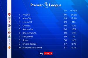 天空预测:阿森纳本赛季80分问鼎英超,最低70分即可夺冠或创新低