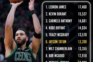 塔图姆(25岁363天)在27岁前的总得分来到13390,超越张伯伦,暂列历史第六。