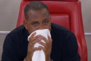 随后,他就一直坐在教练席上不断地用毛巾抹脸,眼眶泛红,场上队员和工作人员和马宁发生冲突他也只是看着。