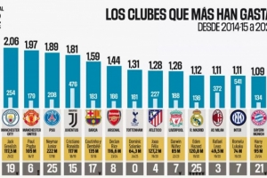 体育资讯3月2日讯 德转统计自2014/15赛季以来在转会上投入最多的15家欧洲俱乐部,英超BI6全部上榜&切尔西第一,皇萨仁在列。