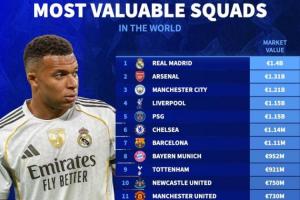 最新俱乐部球员身价排名(单位:欧元):