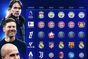 体育资讯3月2日讯 《转会市场》列出了欧洲七大联赛近5年联赛冠军情况,英超、德甲和法甲班霸均只让冠军1次旁落。