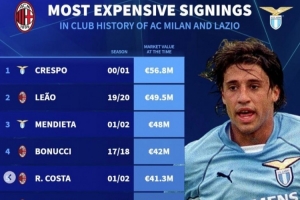 体育资讯3月3日讯 米兰将在本轮意甲焦点战对阵拉齐奥,《转会市场》也列出了两队历史转会费最贵榜单。