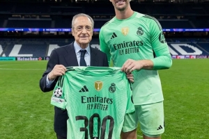 库尔图瓦达成皇马生涯出战300场里程碑,俱乐部主席弗洛伦蒂诺向他颁发了纪念球衣。