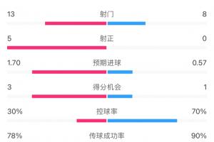切尔西本场0次射正,布莱顿5次射正。射门数方面,布莱顿13-8领先切尔西。