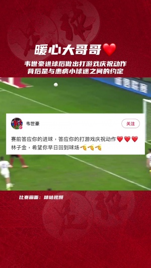 体育资讯03月03日讯 本轮中超联赛,成都蓉城1-2天津津门虎。比赛第25分钟,韦世豪破门后做出打游戏的庆祝动作,赛后被披露这原来是他与患病小球迷间的约定。